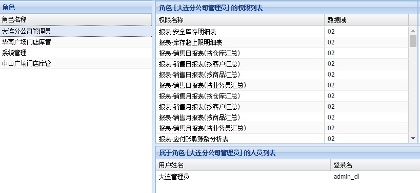 【大连分公司管理员】这个角色的权限中各个数据域都设置成了【02】,其中02代表的是大连分公司的数据域。